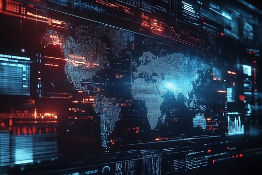 A futuristic digital world map with data visualizations and interconnected nodes, representing global connections.