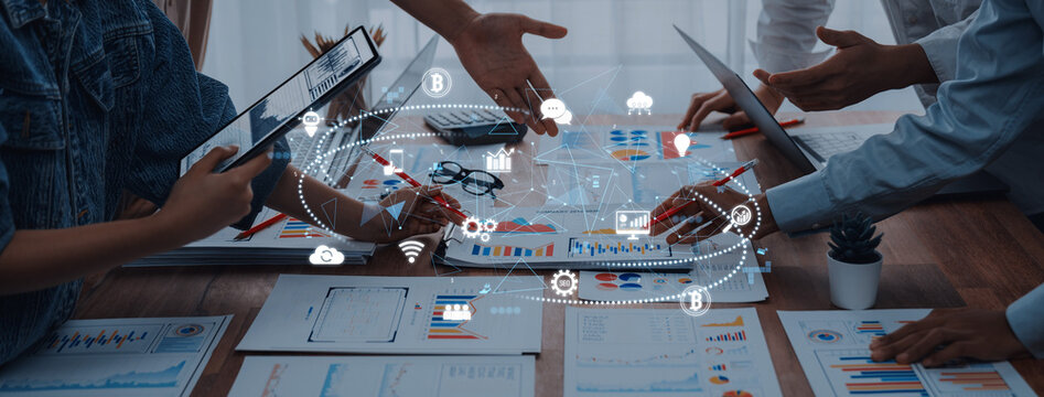 A dynamic office setting showcases hands engaged in collaboration over charts and technology, emphasizing teamwork, strategy, and data analysis for business success. Trope