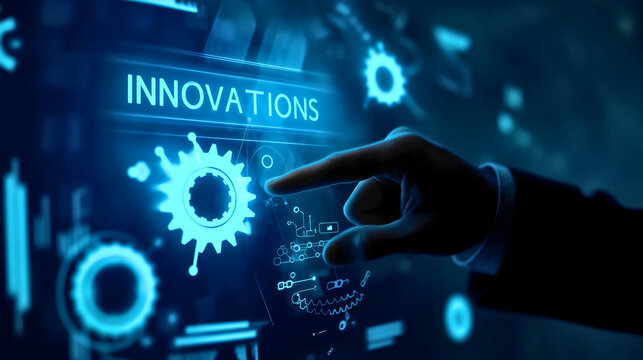 Businessman's hand or finger touching the virtual digital blue display screen with text innovations and cogwheels or gears. Strategy for success concept, solution to a problem, system development