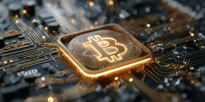 Glowing digital currency symbol rests upon complex electronic circuitry in close up