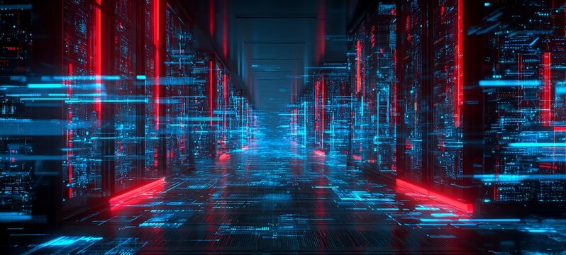 Abstract data flow in server room with glowing blue and red streams, network connections, and circuit patterns. Futuristic IT concept for data processing, technology infrastructure, and digital networ