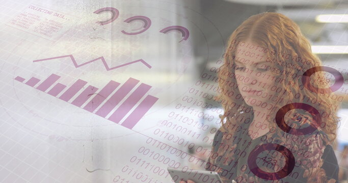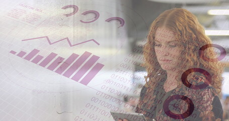 Image of financial data processing over caucasian businesswoman working in office