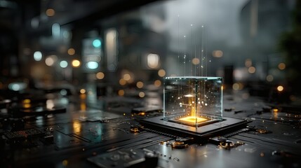 Glowing circuit board with green data bars representing digital information flow and processing, ideal for technology and innovation concepts, on a dark background