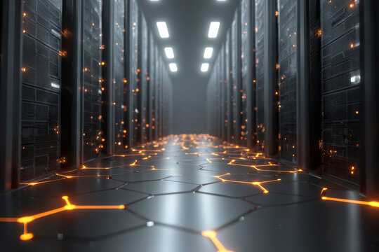 Data center operations high-tech server room modern facility digital infrastructure low light technological innovation