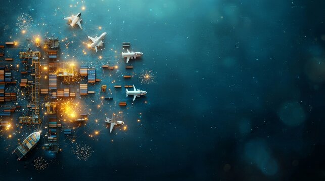 Air freight operations and global trade dynamics port city digital art aerial view transportation and logistics concepts