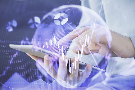 Double exposure of man's hands holding and using a digital device and forex graph drawing. Financial market concept.
