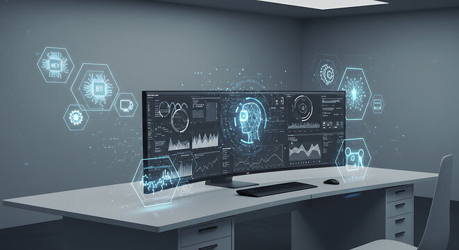 Innovative data processing action tech studio digital art modern workspace close-up technology concept