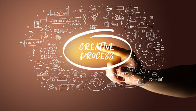 Hand touching CREATIVE PROCESS inscription, hand drawn icons around, business plan concept