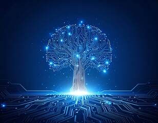 A digital tree formed from circuit boards with glowing lines on a blue background