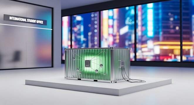 Innovative technology showcase at international student office with urban cityscape view
