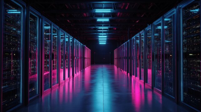 Futuristic data center server room with neon lights technology and network concept