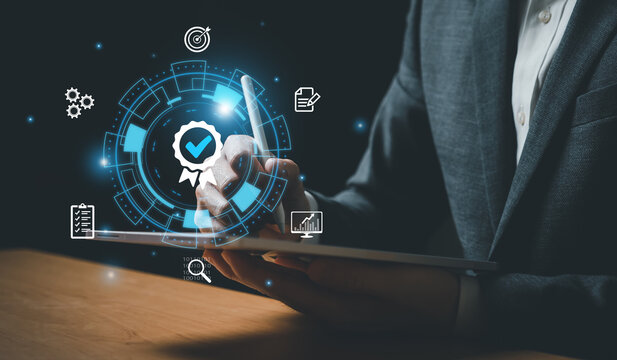 Entrepreneur using digital tablet to approve certificate that show top service quality standard in business or commercial service certification. Quality assurance formal concept in organization.