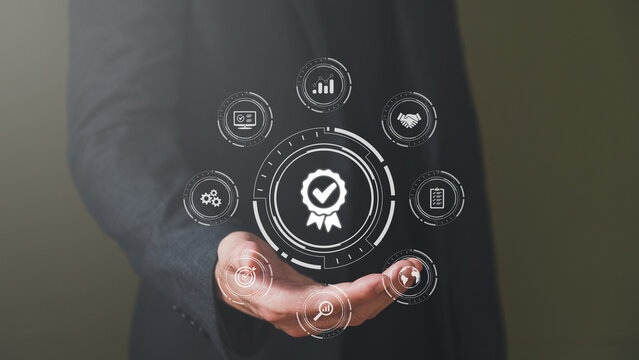 Businessman show thumbs up with icon that show top service quality standard in business or industrial ISO certification. Quality assurance formal concept in organization.