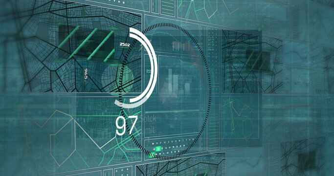 Magnifying glass over an eye surrounded by digital screens displaying data