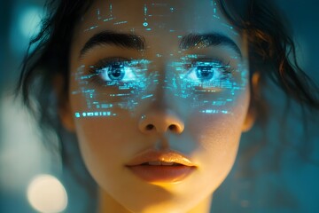 Woman with Futuristic Projection Over Her Face Showing Digital Technology Concept