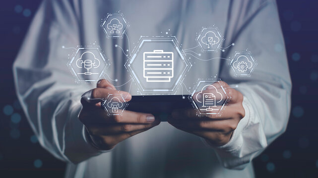 Cloud database icons connected through digital interface represent data storage, business communication, and modern technology innovation, displayed on a smart device for efficient network management.