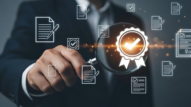 Auditing and compliance concept with a businessman using a magnifying glass to inspect digital document icons