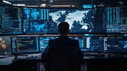 Man observing large data visualization screen.