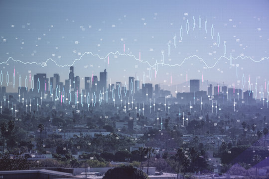 Double exposure of forex chart drawings over cityscape background. Concept of success.