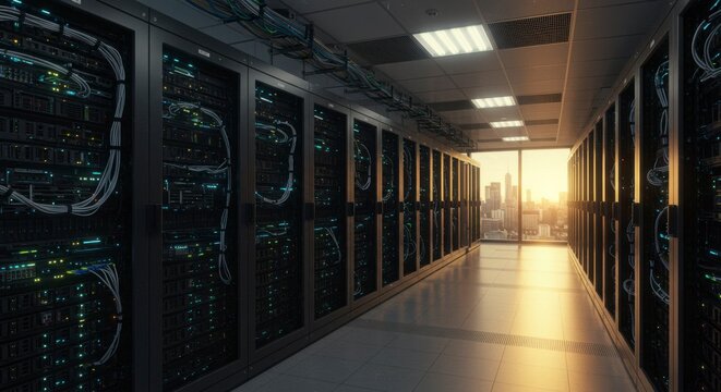 A panoramic view of a cutting-edge server room. showcases rows of powerful data servers and network infrastructure, suggesting modern technological power.