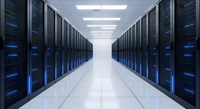 Perspective view of a server room hallway in a modern data center with glowing blue lights.