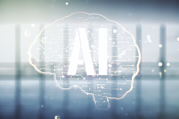 Virtual creative artificial Intelligence hologram with human brain sketch on empty corporate office background. Multiexposure
