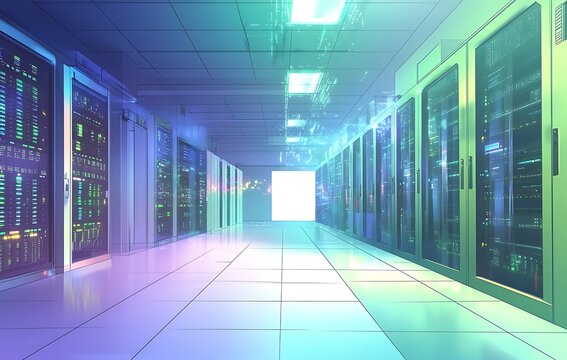 Modern Data Center Hallway with Rows of Glowing Server Racks and Advanced Network Infrastructure for Information Technology.