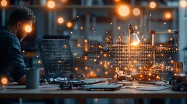 A focused professional works on a laptop in a modern office environment, showcasing advanced technology and digital innovation in a sleek, well-lit space.