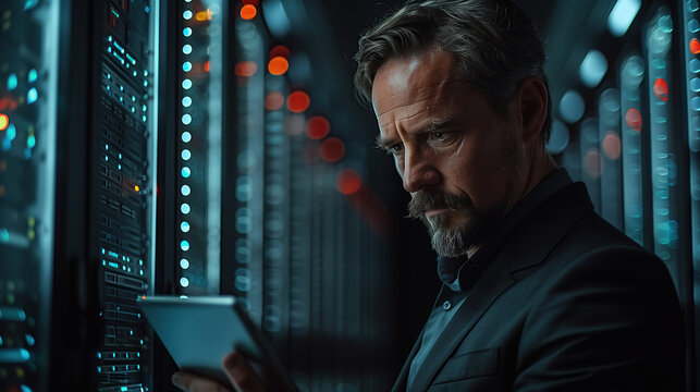 A businessman uses a tablet to manage and monitor data in a computer server room. The modern setting symbolizes efficiency and technology in business operations. Generative AI.