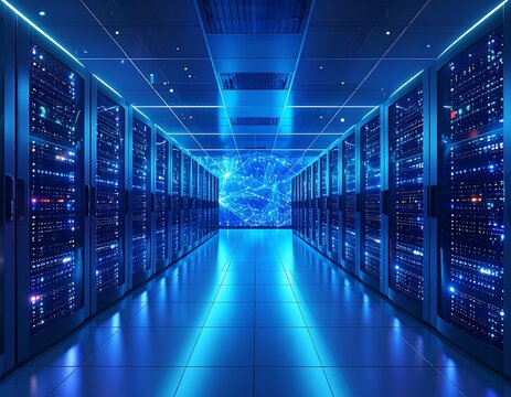 Powerful server room with data projections. Tech infrastructure hosting computer equipment for digital tasks. Data center with glowing circuits, futuristic interface. AI, big data, tech processing