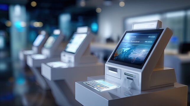 Modern Self-Service Kiosks in a Brightly Lit Technology-Focused Environment
