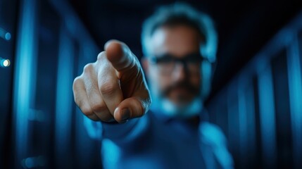 The image shows a focused businessman pointing in a dark server room, emphasizing themes of leadership, technology, and decision-making in a high-stakes environment.