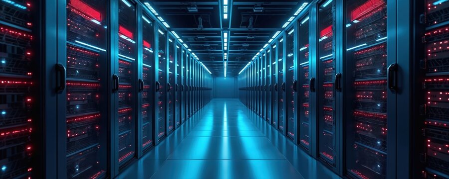 Data center server room with network equipment. Rows of server racks with blinking lights. Cyber security, data storage, cloud computing, information technology concept. Blue, red colors.