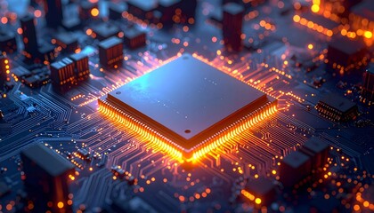 The vibrant microchip glowing in a sophisticated circuit board design.