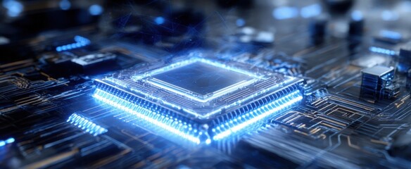 Close-up view of a glowing microchip on a circuit board showcasing intricate electronic components