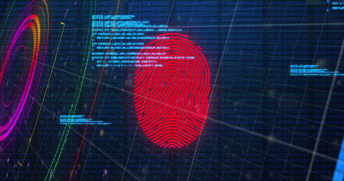 Image of data processing, fingerprint and colorful shapes on navy background