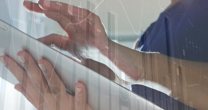 Image of statistical data processing over mid section of a woman using digital tablet at office