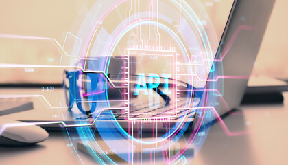 Multi exposure of data theme drawing hologram over topview work desk background with computer. Concept of technology.