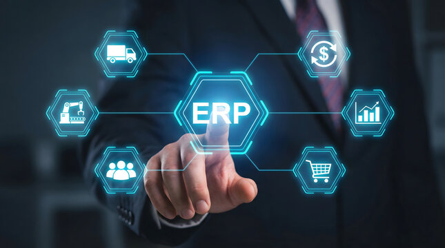 a businessman interacts with a glowing circular interface displaying various digital icons representing data analysis global connections and strategic business solutions in a