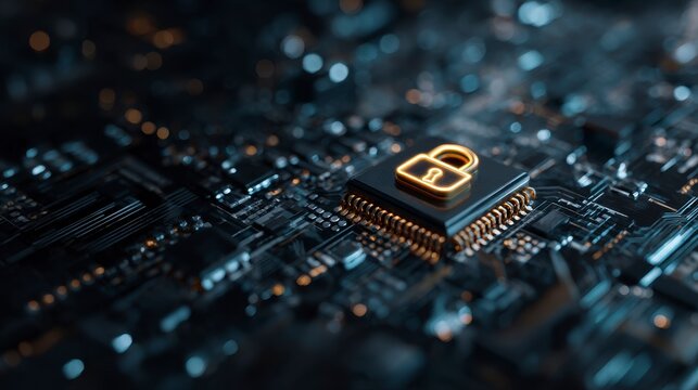 Close-up of a circuit board with a glowing golden padlock symbol, highlighting data security and encryption