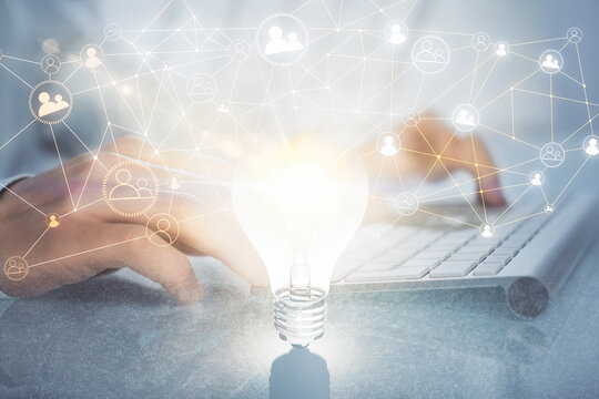 Social network theme hologram with businessman working on computer on background. Multi exposure.