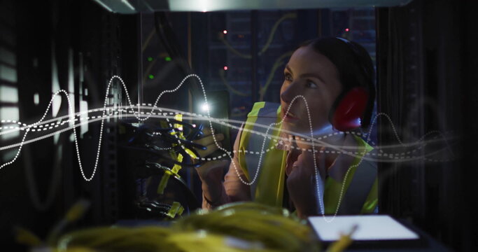 Image of digital data processing over it caucasian female technician computer servers