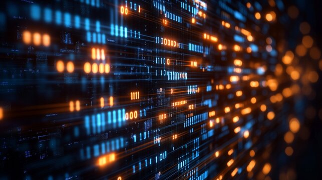 Abstract digital data flow, glowing orange lines on dark blue background.