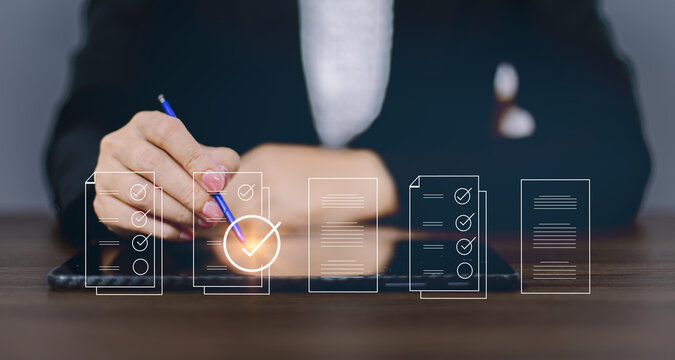 Generative AI artificial intelligence generate document and business files. Intelligent automation IA system and technology. Businessman typing on laptop computer keyboard. Check mark and file icons.