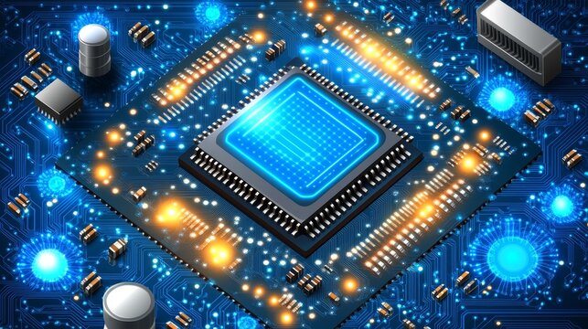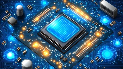Computer chip on a circuit board with a glowing blue background in a technology setting