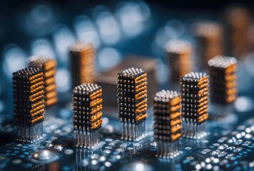 Macro shot of an intricate circuit board with silver legs and golden markings, set against a softly blurred blue background of lights