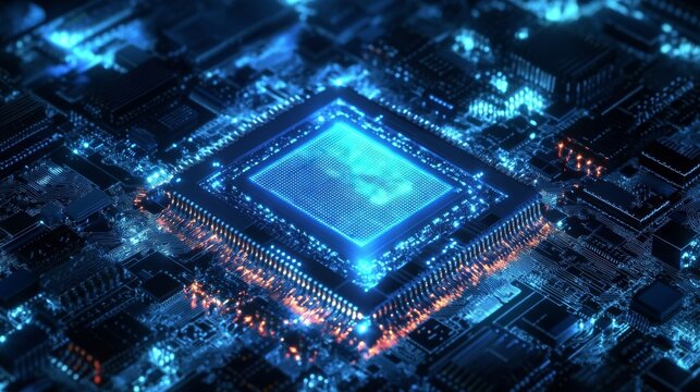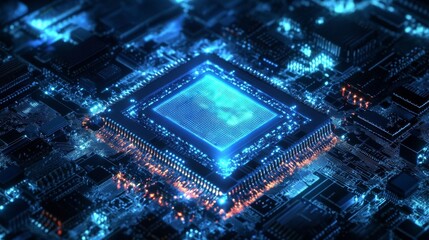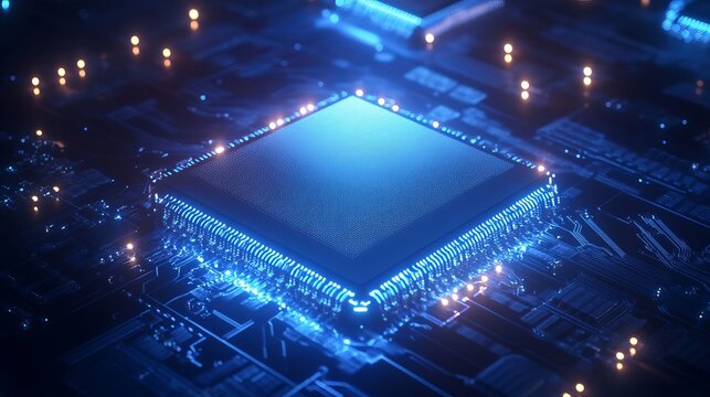 A futuristic microchip processor with lights on a blue background, representing a quantum computer and large data processing. The design includes an isometric view of the CPU and digital chip