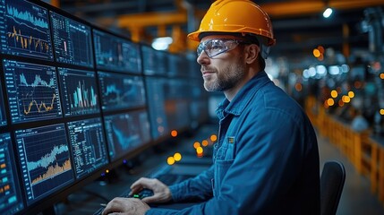 Aerospace engineer analyses aircraft design on computer monitors. Man works with aerodynamic simulations in office. Tech, business concept for aviation, engineering, research, innovation.
