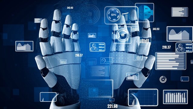 Robotic hands interact with dynamic data visualizations and graphs in a modern tech setup, showcasing the seamless blend of technology and information analytics. Xenic
