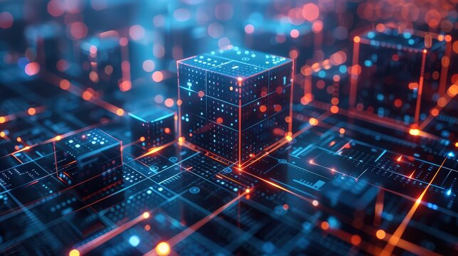 3D Render of Cube Technology at Converging Circuit Points on Abstract Blue Background Representing Blockchain, Big Data, and Digital Security